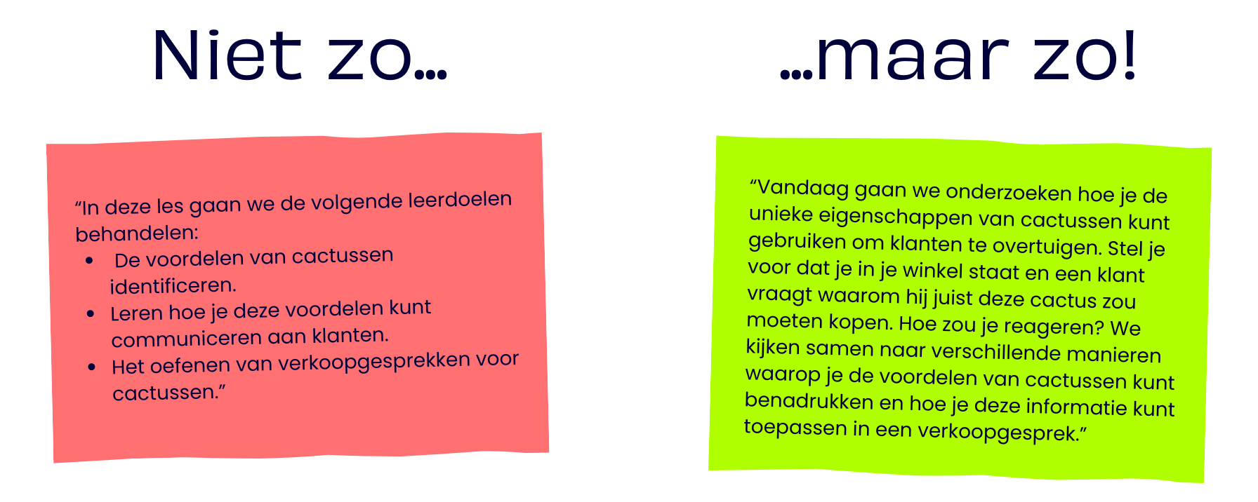 Vervang de leerdoelen met korte, praktische vragen (“Kun je…”).